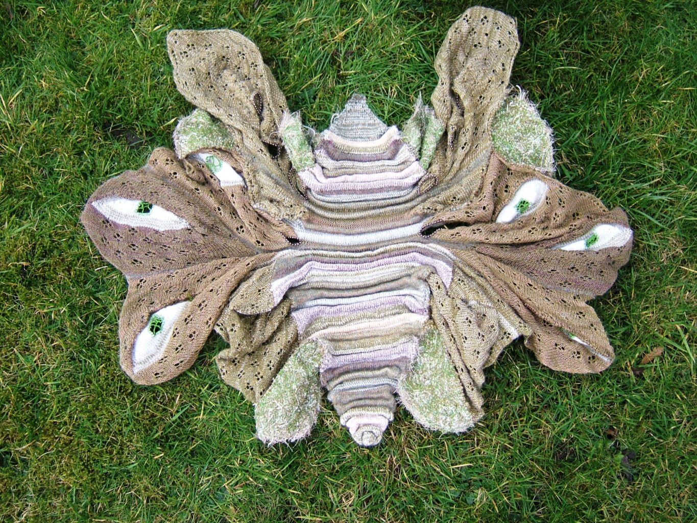 Since I first learnt how to use the knitting machine I have been trying to break into the third dimension and create sculpture, mainly by manipulating flat pieces of knitted fabric and making them more lumpy, by either adding items to them, such as the broken bits of china in “Why would anyone keep a broken gravy jug?” (left); or creating folds and drape as in “Discomfort Blanket” (below), two pieces I made while I was a distance learning student at Bradford College between 2007 to 2009