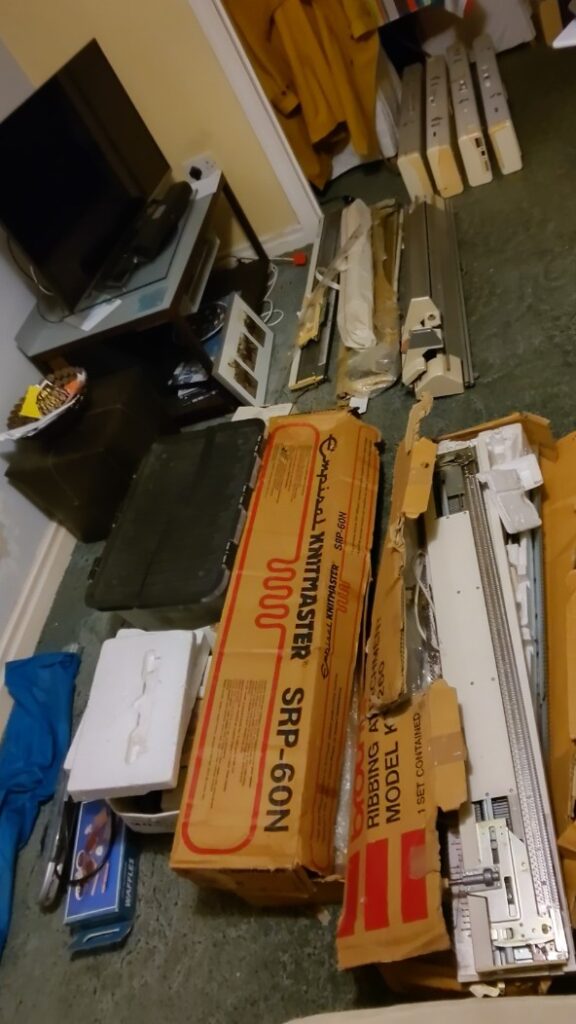 In March 2024 my friend allerted me to a facebook post that effectively said these are going to the tip tomorrow, come and get them if you want them and that by 9pm she noticed they were still there. There were some seriously good machines in that pile! My husband and I ventured out in the rain and rescued the lot! All need a lot of refurbishment. Two of them, the Brother KH260 Chunky and the Knitmaster Zippy Plus SK280 (with their ribbers and a colour changer) are the best possible machines to make sculpture on, one able to use thick, chunky wool and the other, one of the best machines to incorporate colour into sculpture.